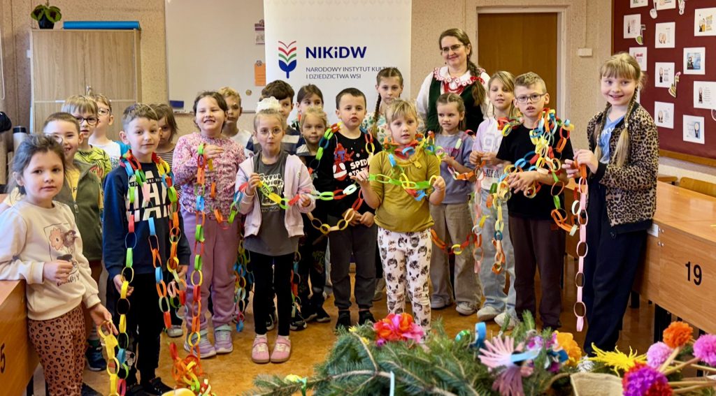 W części warsztatowej uczniowie wykonali piękne, tradycyjne ozdoby choinkowe – koszyczki oraz łańcuchy, które już wkrótce zawisną na domowych choinkach.