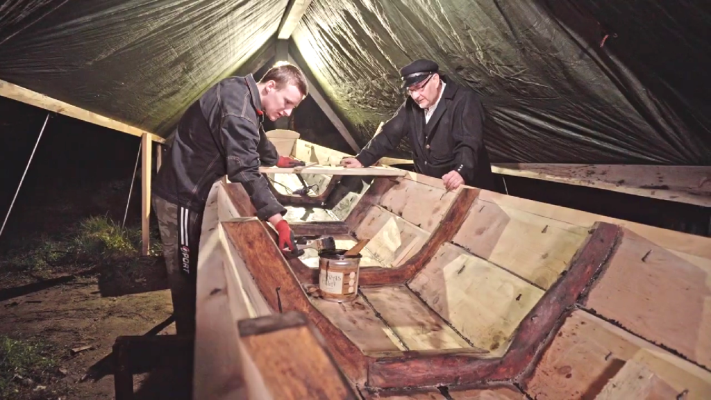 Mistrz Rafał Kmieć i uczeń Kamil Brzeziński opowiadają o tradycyjnym szkutnictwie, historii miejsca, starych sposobach budowy łodzi typu pomorskiego i nowym na to spojrzeniu, o drewnie, które stawia swoje warunki, flisactwie, łowieniu ryb i współczesnym pływaniu po rzece.
