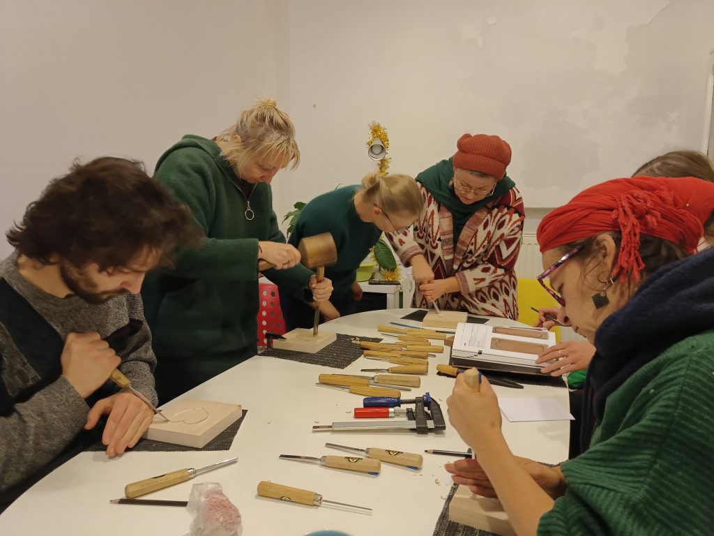 8 grudnia, zapoznaliśmy się z techniką tworzenia drewnianych form piernikarskich dzięki Beacie Pranke-Ździebło. Warsztaty nawiązywały do bogatej tradycji toruńskiego piernika, którego kultura w 2025 roku została wpisana na Krajową Listę Niematerialnego Dziedzictwa Kulturowego. Główną częścią spotkania była praktyczna nauka snycerstwa, czyli tradycyjnej sztuki rzeźbienia w drewnie.